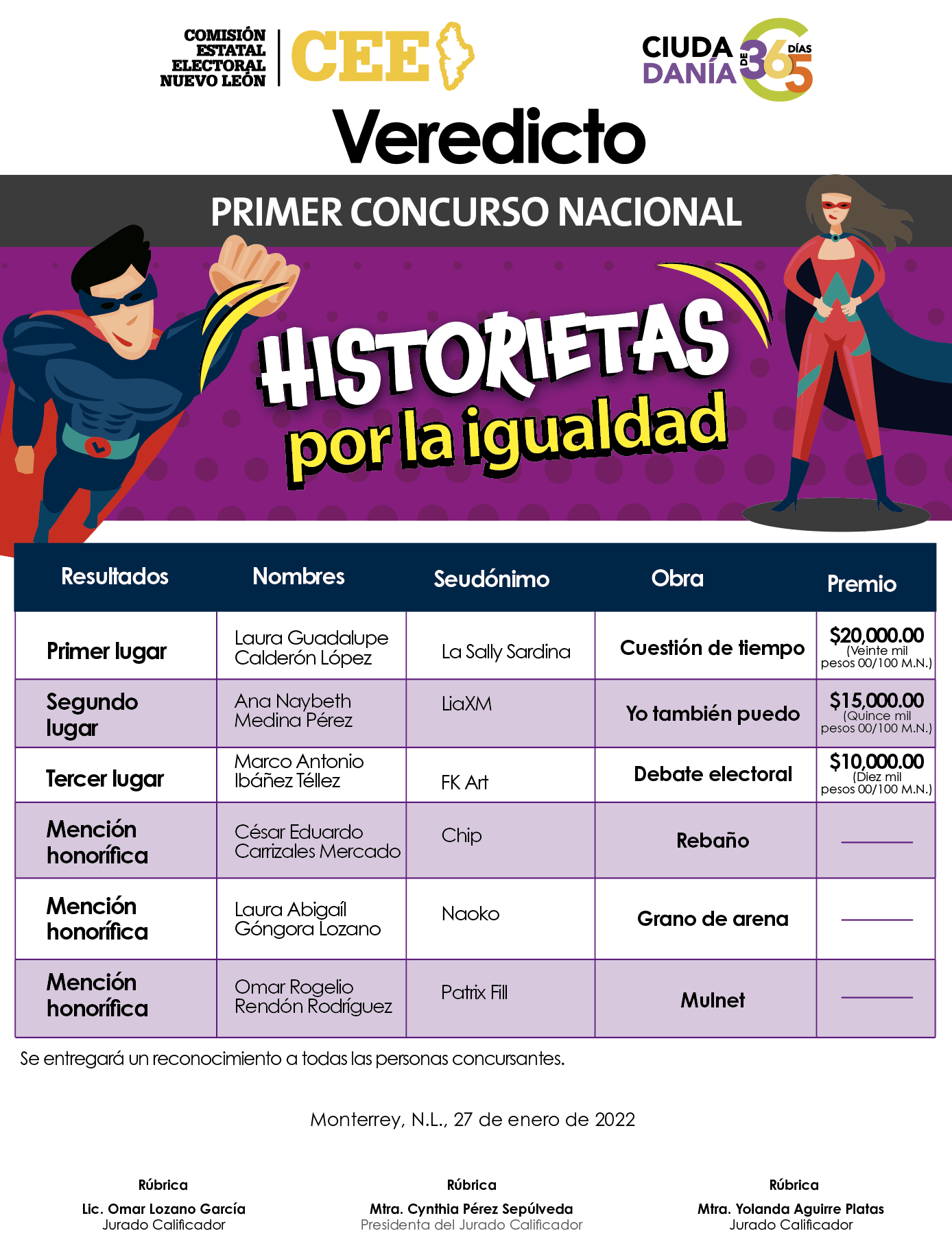 El veredicto del jurado calificador publicará en esta página, así como en el sitio web de la Comisión Estatal Electoral y sus redes sociales. El 31 de enero de 2022.